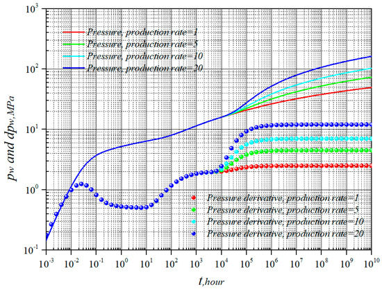 Figure 7 shows the effect of adjacent well production changes on the pressure derivative in the multi-well system. The dimensionless production rate of adjacent wells varies from 1 to 5, 10, and 20. A comparison of pressure derivatives shows that interference from adjacent well production affects the transition flow region of the test well and the pseudo-radial flow region of the multi-well system. As the production rate of adjacent wells increases, the slope of the pressure derivative curve increases gradually during the well interference transition flow regime. The pressure derivative curve also displays a horizontal line in the pseudo-radial flow regime of the multi-well system, and its value is proportional to the production rate of the adjacent well. Flow regime analysis shows that rate variation in adjacent wells affects the pseudo-radial flow during interference within the multi-well system.