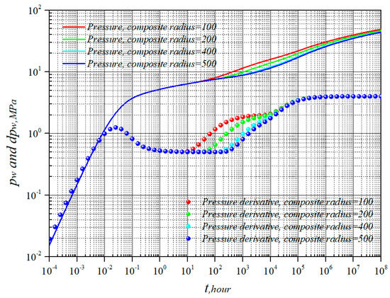 The effect of composite radius changes on tested wells in a multi-well system is shown in Figure 9. The composite radius of the test well is gradually increased from 100 m to 500 m. The comparison of the pressure derivative curves in Figure 9 shows that the change of composite radius affects the radial flow in the inner region, the transitional flow between various regions, and the radial flow in the outer region. As the composite radius increases, the radial flow duration in the inner region gradually increases, and the starting and ending times of the transitional flow in the inner and outer regions are gradually delayed. As a result, radial flow in the outer region is masked. Both transitional flow in the inner and outer regions and radial flow in the outer region have the characteristics of the transitional flow.