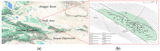 (a) Regional location of the study area. (b) Structure and well location map of the study area (modified from Zheng et al. [34]).