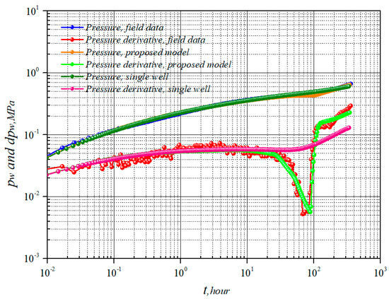 As shown in Figure 10b, two wells in the UGS were selected for pressure transient testing. The target well (a) is in the fourth cycle of cumulative gas injection of 4970.46 × 104 m3 before the pressure transient testing, and the daily gas injection rate is stable at 21.67 × 104 m3/day. The pressure gauge was lowered to the well bottom hole of 3463 m on 31 August 2016, and the duration of the pressure transient test was 20 days. During testing, gas injection into the offset well began with varying rates. The cumulative gas injection into the target well (b) in the fourth cycle before the test was 10,580 × 104 m3, and the daily gas injection rate was stable at 68.68 × 104 m3/day. On 24 September 2016, the pressure gauge was lowered to the bottom hole at 3472 m, and the cumulative test duration was 19 days. During the test period, gas was injected into the adjacent well (a) at an average rate of 24.4341 × 104 m3/day from 23 September to 1 October. Gas was injected into the adjacent well (b) from 24 September to 1 October at an average gas injection rate of 27.24 × 104 m3/day. The pressure testing data in Figure 11 and Figure 12 show that the derivatives decrease, and the difference between target wells (a) and (b) is that the test period is different. For target well (a), the impact time of falling down is the ending period of the pressure derivative. This test time for target well (b) is in the middle and late stages of the derivative curve. Combining the test period of the target well with the production period of the adjacent wells, we can draw the conclusion that there are well interference and formation heterogeneity. The single-well models in Figure 11 and Figure 12 could not match the later stage of actual data. Further, we used the proposed model to match the field data and compared pressures and derivatives in Figure 11 and Figure 12 which illustrate the applicability of the model. The reservoir, well, and gas properties are provided in Table 5 and Table 6.
