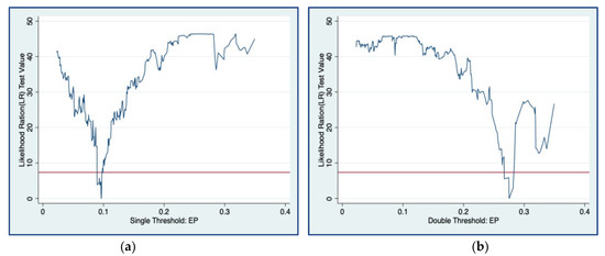 is the threshold value; represents the indicative function, and the other variables are as in Models 1–3. As there may be a double threshold or triple threshold in the panel threshold model, it is necessary to construct the corresponding number of threshold models for analysis. This paper does not report these, but the number of threshold models will be tested in the post-empirical analysis and parameter estimation.
