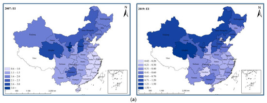 Regional energy intensity can more accurately measure a region’s energy efficiency. This depends on the scale of clean energy used in production and regional energy conservation and emission reductions. This paper refers to Xu Yang and He Yongxiu’s (2016) [104] research, which used the annual energy consumption and actual GDP ratio to measure energy intensity. This index can be obtained by direct query from the China Energy Statistical Yearbook, and the unit is “ton standard coal/10,000 yuan” (In 2007, the average exchange rate between USD and RMB was about 7.6. In 2019, the average exchange rate between USD and RMB was about 6.9). The lower the regional energy intensity, the lower the energy a region consumes per unit of GDP and the higher the regional energy utilization efficiency.