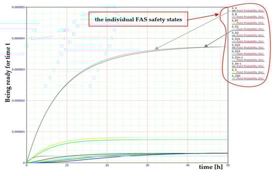 Calculated values of individual availability coefficients over time, for individual safety states, as in Figure 7, for an FAS integrated with smoke exhaust and common fire detection, were conducted using statistical data collected from 20 systems operat-ed within CI facilities. For the purpose of determining the λ damage intensity and µ recovery intensity, the authors of the article divided FAS into components making up the entire system, i.e., detectors of a specific type, modules, signalling devices, etc. The aforementioned operation process coefficients were determined for individual FAS elements. All 20 FAS were operated under similar environmental conditions, with local access to servicing at the place of operation and the so-called on-site spare part stor-ages should any unfitness event occur (repair commenced immediately after obtaining information on the partial damage status from the fire alarm control unit). Due to their complexity, the computations were conducted using a BlockSim computer application by ReliaSoft. The ReliaSoft BlockSim, as a specialized computer application, provides a platform for testing system reliability, FAS in this case. Computer software enables computing FAS availability and conducting analyses in this respect. The presented computer application computations and graphs enable a conclusion that an appropri-ately designed and executed FAS exhibits a significantly high availability coefficient kg(t), e.g., for time t = 1.125 [h] kg(t) = 0.999 (Table 1). This is a consequence of the fact that individual FAS elements, devices, and base modules offer appropriate technical and system solutions that utilize redundancy and the so-called fail-safe concept. An important operational issue for FAS is related to the so-called “infant age failures (un-fitness)” that are manifested at the initial system operation stage (Figure 9). The initial FAS operation period (up to 40 h of system operation from activation-commissioning) experiences a loss in the values of the kg(t) availability coefficient. This coefficient sta-bilizes after this period at a value equal to kg(t) = 0.999-(Figure 10). Virtually the same value of the kg(t) availability coefficient is maintained for a time t = 8760 [h]. In the in-itial operation period, the predominant operational states (exhibiting the highest val-ues) of FAS are the S_0 state of full fitness (designation in Figure 9 according to the simulation software) and the S_D1 state (detection loop No. 1, detector No. 1) (Figure 9). Other operational state coefficients with respect to the FAS provided for calcula-tions and simulations reach very small values below 1·10−6 and they can be practically omitted within the process under consideration.