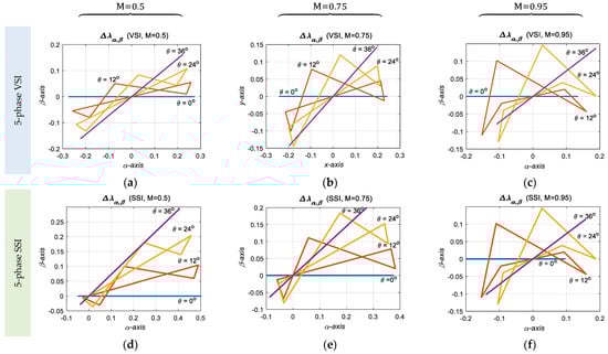 Assuming zero initial conditions for the harmonic flux at the beginning of the switching period, Figure 14c,d show the harmonic-flux trajectory in both subspaces for M = 0.75 and . To give a fair comparison, Figure 15 shows the trajectory of the harmonic flux for both five-phase VSI and SSI. It is worth noting that the VSI is modulated by the conventional SVM, while SSI is modulated by the MSVM scheme. Based on (22), the mean-square value of the HDF in the and planes over a sampling interval () is