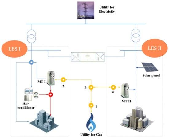 As shown in Figure 2, different energy systems, i.e., electricity, gas, and thermal systems, are coupled by energy conversion units, such as MTs, gas boilers, and air-conditioners. These systems, combined with other DGs and energy storage facilities, exchange energy with external electricity and gas networks, and provide energy services to host facilities. In most cases, LESs only take in gas from the gas network when no gas acquisition equipment exists, such as LES 2 and 3 in Figure 1. The LES without gas loads is considered a special form of LESs which is connected to the electricity network only, such as LES 1. Using different coordination strategies, LESs can operate independently or in conjunction with nearby LESs. For example, LES 1 and 2 in region I can exchange power with each other through channels, such as soft opening points (SOP) [24].