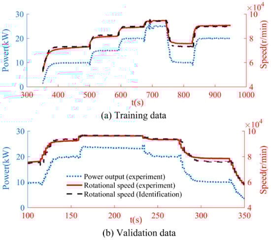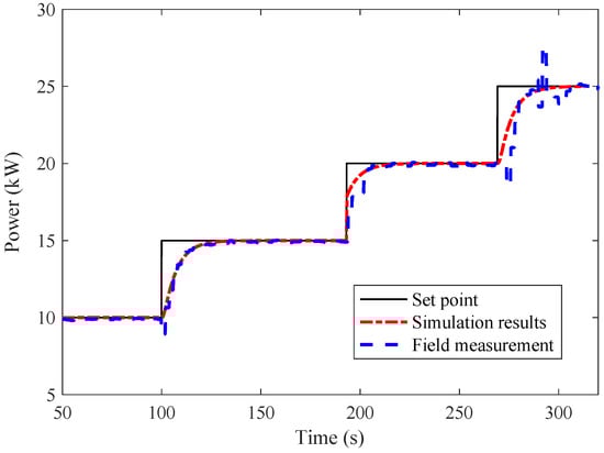 The coupling unit model, i.e., the MT model, is obtained by adding a nonlinear part to the model developed in [10]. The parameters of the nonlinear part are extracted from a Capstone C30 MT. According to (6), the load signal and the engine speed of the MT are selected as the input and output of the nonlinear model. Two groups of data are employed for model training and validation, as depicted in Figure 5. It can be observed that, with the nonlinear part included in the model, the proposed model can well reflect the change trend of the MT rotational speed. As a further validation, the simulation results of MT power output are compared with the field measurement data. It can be seen that from Figure 6, the power output of the proposed model is highly consistent with the field measurement in most cases. Note that some fluctuations of MT power output are observed in the field measurement when the set-point reaches 25 kW. This is due to the fact that the studied MT is connected to a low-pressure gas network that limits the maximum MT power output. The MT shows strong nonlinear features when closing to the maximum power output.