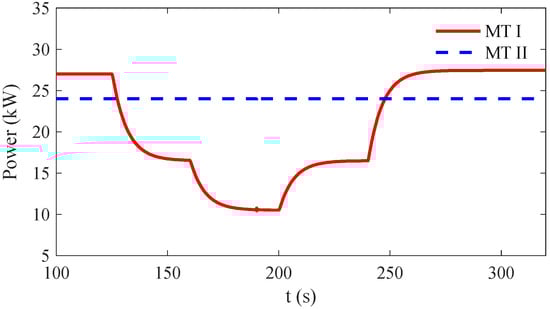 Without loss of generality, the MT in LES I (hereafter referred to as MT I) is adjusted to analyze its impact on the gas network. The power output of MT is shown in Figure 7. The power output of MT II is set be constant at 15 kW. As shown in Figure 8, the MT output variations lead to the pressure fluctuation of the whole gas grid. As the MT output decreases at 120 and 160 s, the gas pressure increases when it reaches steady states. It can be noticed that the proposed model is able to capture the changing use of fuel during the transient process. Due to less gas consumption, the maximum value of the MT inlet pressure is higher than its steady-state value during the deceleration process. Similar results can be observed as the MT output increases at 200 and 240 s. During the MT acceleration process, more gas is absorbed and leads to a serious pressure drop which is lower than 2000 Pa. The short-term pressure drop can further affect the state of other gas-fueled equipment connected to the same gas network. In the extreme scenarios, it can trigger the protection scheme and shut down the pressure sensitive equipment, such as the MT.