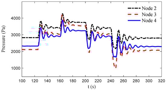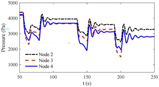 Assume that a fault occurs to the power grid at 54.9 s, the two LESs are then disconnected from the power grid at 55 s. The operating mode of the LESs is switched from the dual-grid-tied mode to the gas-grid-tied mode to adapt to the mismatch between the generations and the loads. Suppose that the two LESs require more generations, the two MTs increase their power outputs as shown in Figure 11. A pressure drop can be observed in the gas grid at 55 s as shown in Figure 12. The minimum pressure of the gas grid is lower than half of the steady-state values, which will affect the operation of other pressure-sensitive loads in the surrounding areas. Moreover, impacts of the two MTs on the gas grid overlay during the transient process. Although the inlet pressures of the two MTs converge to values which are higher than 3600 Pa, the minimum value of the pressure during the adjustment process is below 2500 Pa, due to the increasing use of gas for both MTs. The minimum value at Node 4 is even lower than the steady-state value after the MT power output increases at 149 s, where more gas is consumed by the MTs. Since the amount of energy imbalances are not the same, the required periods for MT adjustments are different, which lead to some pressure fluctuations during the mode switching process in addition to the pressure drop. When multiple MTs co-exist in one gas grid, behaviors of the gas grid and LESs can be more complex. Therefore, dynamic analysis is vital for the design of LES management and control system.