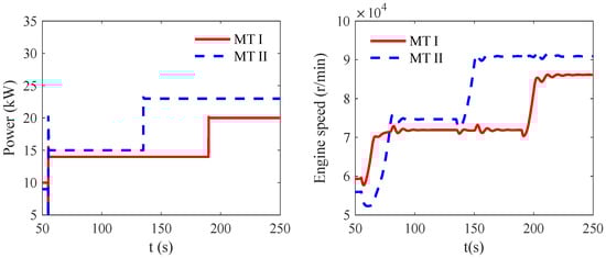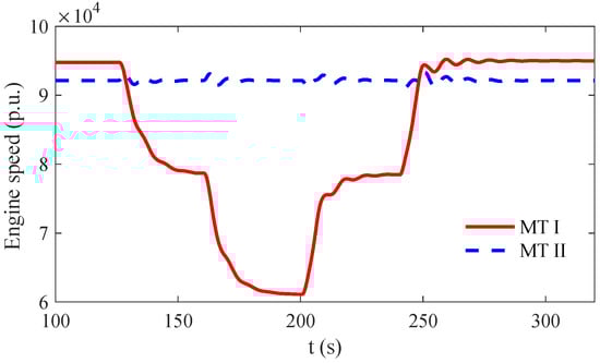 From the viewpoint of the LESs, the pressure change in the gas grid can affect the operation of the LES, as well. As illustrated in Figure 9, although the output of MT II is set to be constant, some speed swings can be observed in the MT. This is due to the fact that the MT fuel control system increases the valve opening to maintain the MT output at the set-point. Moreover, compared with the smooth power output changes, the gas system requires a significantly longer period (more than 20 s) to converge to the steady state. Therefore, to avoid the lagging influence of the slow varying gas system, its dynamics should be taken into account in LES control and dispatched if it involves MT adjustments.