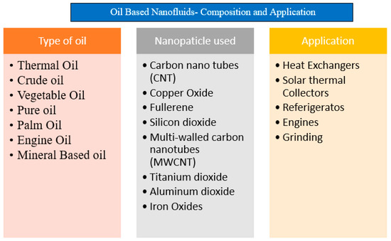 The utilization of the Oil-Based Nanofluids finds its application in various applications as shown in Figure 1. Various applications using the oil-based nanofluids delivers an effective and prolific results in their performance. Hwang et al. [31] reported augmentation in the thermal conductivity of nanofluids with an increase in the particle volume fraction (φ); except for nanofluids with water as base of low thermal conductivity. Hekmatipur et al. [32] and Javed et al. [33] synthesized a copper oxide nanofluid and found that the thermal properties increased as compared to the base fluid. The nanoparticles such as copper oxide, fullerene, silicon dioxide, and multi-walled carbon nanotubes () with base fluids (water, ethylene glycol, etc.) were studied by Hwang et al. [34], Vasheghani et al. [35], Yu et al. [36], Gholamipour et al. [37], and Farbod et al. [38]; the studies reported that increasing the value of φ enhances the thermal conductivity of nanofluids.
