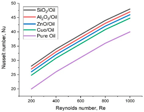 A comparison of various nanoparticles was conducted based on Nu generated where the base fluid used was pure oil. Figure 2 shows the variation of Nu for different Re using various nanofluids. It was revealed that SiO2/oil nanofluid delivered the maximum Nu, followed by ,, and pure oil, respectively.