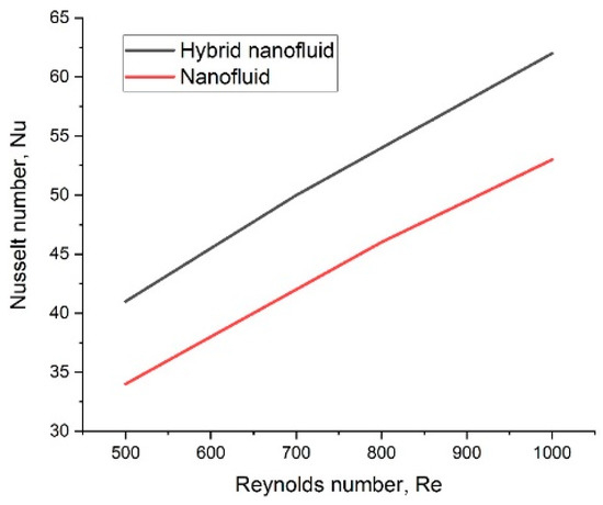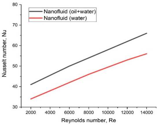 The variation of Nu for different Re is presented in Figure 3, which reveals that the value of the Nu is higher for base fluids of oil + water, compared to plain water. The probable reason for the higher Nu is that oil + water has a high dynamic viscosity compared to water, which results in an augmentation in heat transfer capabilities. The comparative studies in the literature review also show that hybrid nanofluids deliver augmented heat transfer as compared to simple nanofluids, which are boosted by a rise in Re; as represented in Figure 4.