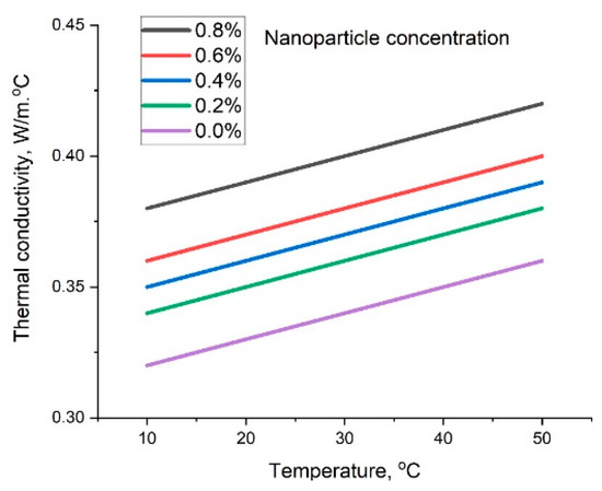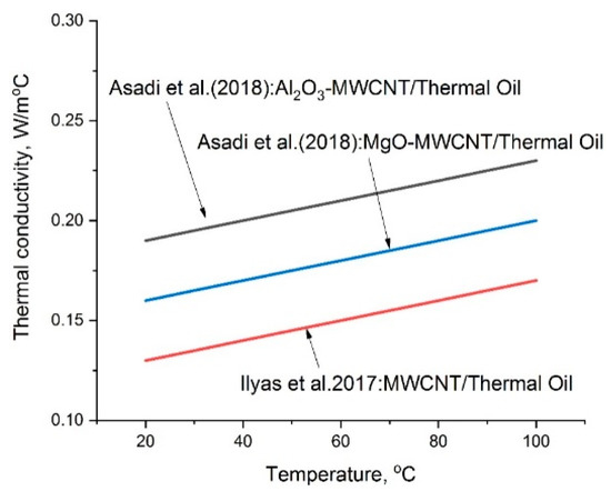 Asadi et al. [77], Tao et al. [137], and Asadi et al. [138] examined the rate of heat transfer of an engine-oil-based nanofluid lubricating oil, with concentrations varying from 0.25 to 2%. They reported that the dynamic viscosity of the nano-lubricant increases as the solid concentration is increased. Finally, they concluded that nanofluids are advantageous for heat transfer applications used as a coolant fluid. Pryazhnikov et al. [139] analyzed the thermal conductivity coefficient of , , and diamond particles based on water, ethylene glycol, and engine oil.