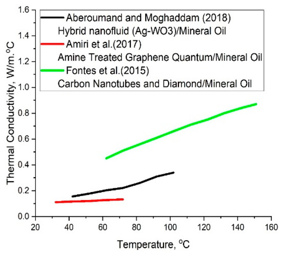 Herper and Entel [154] studied four types of nanofluids for the thermal properties of and nanoparticles in thermal oils. An augmentation in the thermal conductivity of oil by 8% was reported when 0.5 wt.% of aluminum nitride nanoparticles were dispersed, and cooling was enhanced by 20%. In the thermal-oil-based nanofluids with the dielectric breakdown voltage was three times higher than that of pure thermal oil [103]. Beheshti et al. [67] experimentally determined the effect of oxidized MWCNT on the properties of thermal oil, and a decreased breakdown in voltage was reported as the concentration increased. Aberoumand et al. [73] examined the rate of heat transfer of an oil-based silver nanofluid with parameter temperatures ranging from 40 °C to 100 °C and mass fractions of 0.12 to 0.72%. The enhancement in viscosity depends on temperature, whereas the specific heat capacity decreases as the mass concentration of nanofluids increases. Sadegh et al. [73] and Mohammadi et al. [155] and found that the thermal conductivity of a thermal-oil-based nanofluid was enhanced with temperature, whereas the specific heat capacity reduced as the mass concentration increased. Qin et al. [58] synthesized stearic acid-modified CuS (SA-CuS) nanoparticles with a uniform diameter of 60 nm by a facile two-phase approach Table 13 represents the comparison of a previous investigation on thermal-oil-based nanofluids.