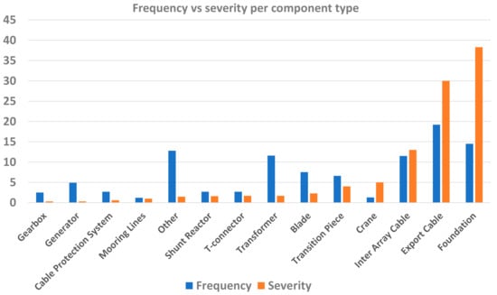 Considering offshore wind farms, where long cable circuits are frequently used, the severity and the frequency of the failures of export and inter-array cables, compared to other components, are highest [10,11]. See Figure 1.