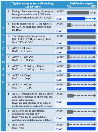 Referring to Refs. [12,19] different test voltages can be used for the onsite testing of power cables. Considering the above discussion on testing HVAC long-length power cables, a comparison of the two most applicable methods, ACRT and DAC, was made. For this purpose, the eleven most relevant technical parameters have been selected as shown in Table 7.