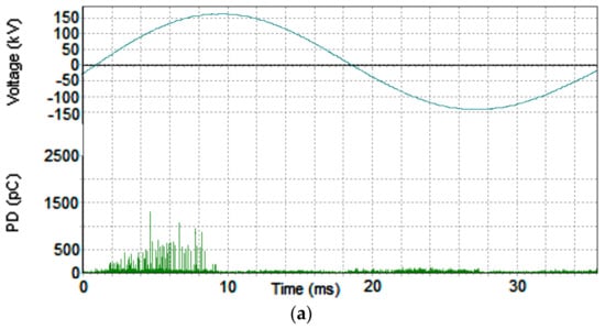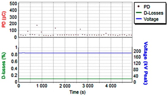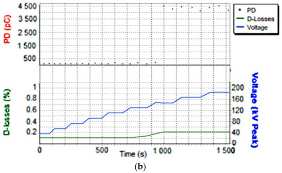 As the PD level was in the range of 100–12.000 pC, it also produced an increase in the dissipation factor tan δ; see Figure 5b. The conclusion was reached that PD could be detected and localized by means of a double-sided measurement.