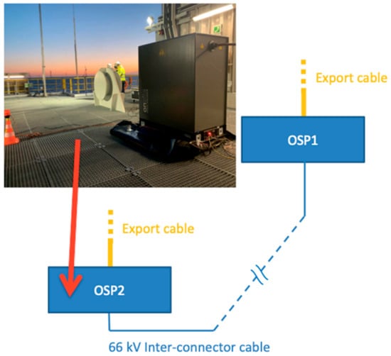 In accordance with [13], the after-laying test of a newly installed XLPE off-shore wind farm 66 kV inter-connector cable system between two offshore substations (OSS) was performed by partial-discharge-monitored damped AC (DAC) testing at 2.0 Uo within the recommended frequency testing range (20 Hz–300 Hz) at 79 Hz power; see Figure 10.