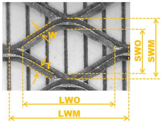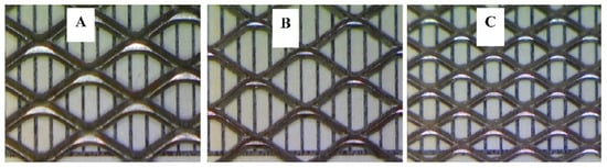 The expanded metal mesh (EMM) is a metal foil that is simultaneously slit and stretched longitudinally into a network of diamond- or hexagonal-shaped holes of uniform size, shape, and regularity [16,17,23]. It comes in four basic types: Raised (or standard), flattened, Gridwalk, and architectural (or decorative) meshes. EMM’s applications include energy absorption, construction, protection–decoration, flow control, filtration, biomechanics, and electrochemical applications [17,24]. Expanded metal meshes are produced from a solid sheet or a plate. Carbon, aluminum, or stainless steel and different alloys including copper, nickel, silver, titanium, etc., can be used as materials. No metal is lost in the expanding process. After the process of cutting and plastic deformation, the area of the EMM is up to 12 times larger and its weight is reduced by 80% per square meter in comparison with the original sheet or plate [17,25]. The final product is much stiffer and more durable and has solid joints and no seams or welds. Because it is made from a solid sheet of metal, it can never untangle. Even if cut at one or more points, the remaining strand intersections continue to hold.