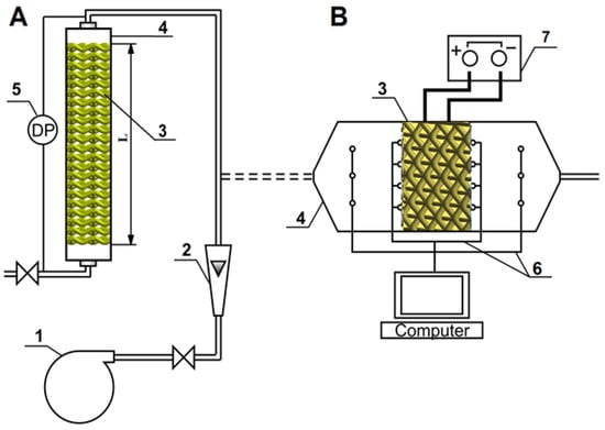 Experimental apparatus for pressure drop (A) and heat transfer (B) measurements: 1—blower; 2—flowmeter; 3—wire gauze; 4—test reactor; 5—manometer; 6—thermocouples; 7—electric current.