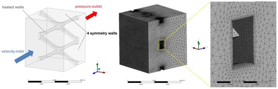 The commercial code ANSYS FLUENT 21.2, based on the finite volume method, was employed as a CFD tool. The geometry models were created to simplify the meshing procedure. The domain was discretized with a high-quality mesh and tetrahedral cells in the core of the domain, while 5 prism layers were implemented near the mesh surface to collect the heat exchange between the mesh wall and the fluid. The detailed computational domain for mesh type B is shown in Figure 4.