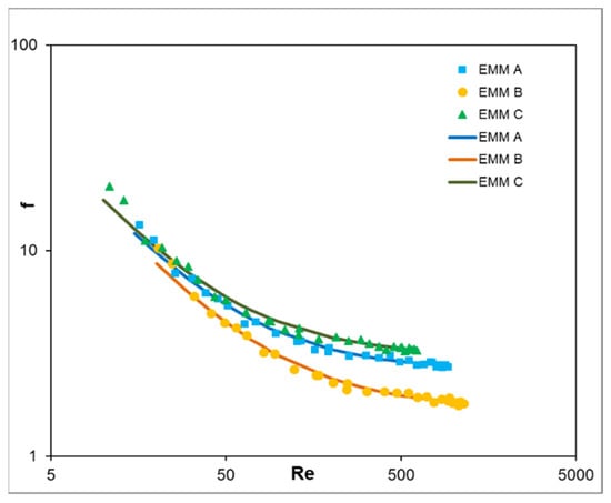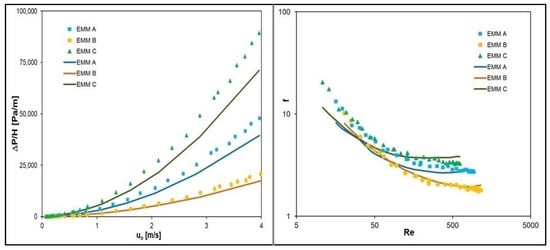 Figure 5 shows the flow resistance characteristics derived from experiments and numerical modeling for all three expanded meshes tested. It is noticeable for all EMMs that the higher the superficial gas velocity, the greater the unit pressure drop (Figure 5 left). The discrepancies in the unit pressure drop between different EMMs also increased. It should be noted that mesh type B indicates the lowest flow resistance, while mesh type C has the highest one. The comparison of experimental and numerical results indicates good agreement; the average relative error ey is approximately 17.4%, 5.7%, and 18.2% for mesh types A, B, and C, respectively. The Fanning friction factor (Figure 5 right) for all meshes studied decreases when the Reynolds number increases, becoming flatter and flatter. However, the lower the Reynolds number, the smaller the discrepancies between meshes types. Computational simulations confirm this trend.
