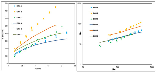 Figure 7 presents the heat transfer results derived from experimental data and computational simulations for all EMMs tested. It is visible for all meshes that the higher the superficial gas velocity, the greater the heat transfer coefficients (Figure 7 left). It should be noted that mesh type B indicates the most intense heat transfer, while the heat transfer characteristics for mesh types A and C are located close together. Similar results were achieved using CFD modeling. The comparison of experimental and numerical results indicates that CFD modelling is able to predict the heat transfer of expanded metal meshes with reasonable accuracy (the average relative error ey is approximately 10.1%, 22.3%, and 14.7 for mesh types A, B, and C, respectively).