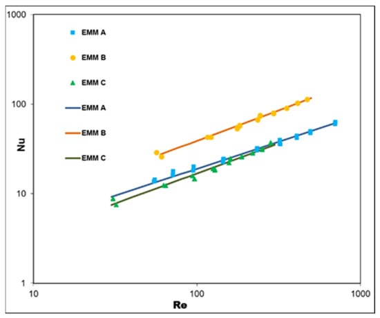 where ΔT is the logarithmic mean temperature difference between the mesh wall and the air at the inlet and outlet sides. The Nusselt number Nu is presented as a function of the Reynolds number Re.