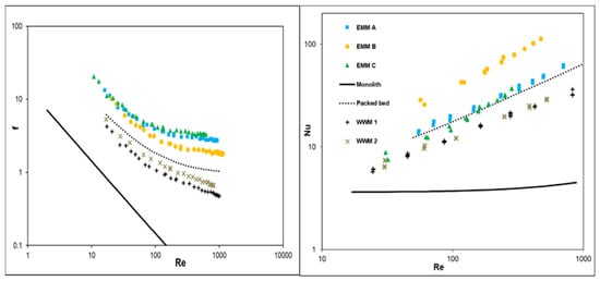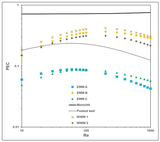 As can be seen from Figure 9, expanded meshes display higher flow resistance than the packed bed, but also more intense heat transfer, especially EMM type B. The lowest values of Fanning friction factors and Nusselt numbers are achieved for the monolith. However, it is not clear which reactor’s internal structure is the most efficient as a catalyst support. One of the meaningful ways to find the best solution for a given catalytic process is to use the Performance Efficiency Criterion (PEC) (Figure 10), which expresses the trade-off of the mass transfer intensity vs. the flow resistance [8,13]: