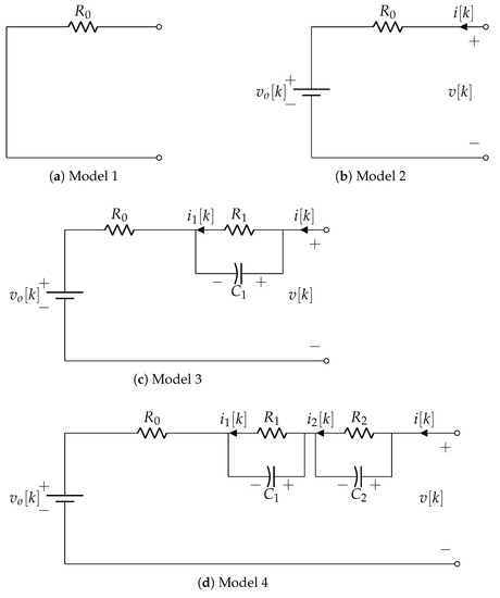 Figure 1 shows four different approximations of an ECM to be considered in this paper. Model 1 represents a short-circuited battery; a detailed analysis of Model 1 parameter estimation can be found in [5]. Model 2 represents the R-int model and is the subject of this paper. Models 3 and 4 represent higher-order and more accurate representations of a battery. Unlike Models 1 and 2, the optimal linear approach to parameter estimation is not feasible in Models 2 and 3. The derivations presented in this section are based on the most general model shown in Figure 1d. Section 3 shows how these derivations can be applied to the other three models.