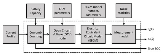 Rechargeable Li-ion batteries are becoming ubiquitous in wide-ranging applications, such as electric vehicles, consumer electronics, power equipment and aerospace systems [1,2]. A battery management system (BMS) is required to ensure the safe, efficient and reliable operation of battery packs. It is quite well known that Li-ion batteries suffer from safety issues when operated outside their allowable voltage ranges. It is the task of the BMS to keep the battery within the operable range to ensure safety. A battery pack that is not properly managed is neither efficient nor reliable. For example, a pack that is not balanced is limited in its performance due to weak cells. Such cells can make the pack useless over time. Consequently, the BMS constantly monitors the battery by measuring the voltage and current of the battery to perform specific control operations [3]. Using the measured data, the BMS accurately estimates crucial diagnostic parameters of a battery pack, such as battery equivalent circuit model parameters (ECM) [4,5], battery capacity [6,7,8], state of charge (SOC) [9], state of health (SOH) [10,11], time to shut down and the remaining useful life (RUL) [12].