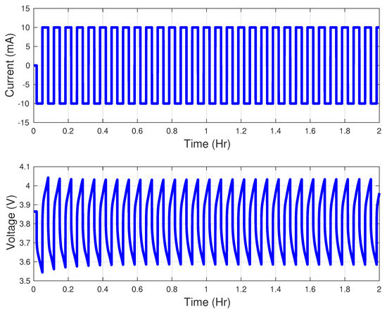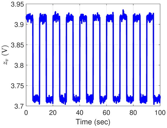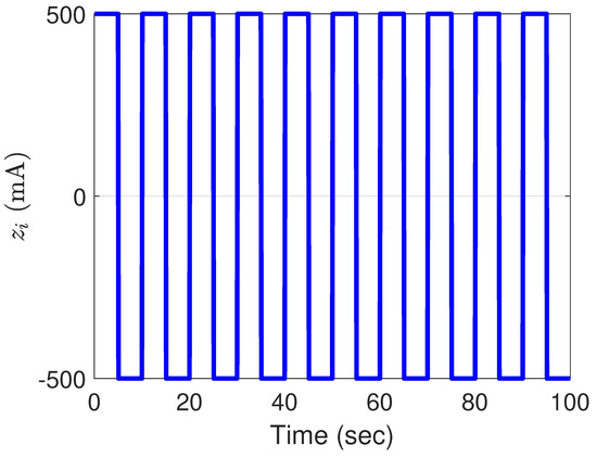 Figure 6 shows the voltage measurements from the battery simulator. Here, the battery simulator is set to Model 2 ECM (see Figure 1), i.e., only had a non-zero value and all other ECM parameters were set to zero. For now, it is assumed that the current profile is perfectly known, as shown in Figure 3; i.e., it is assumed that the current measurement noise is zero.