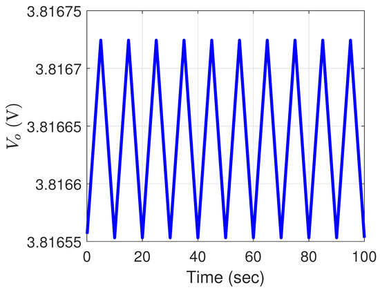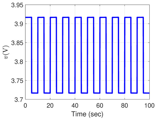 Figure 5 shows a plot of the true voltage across the battery terminals, over time. It must be noted that even though changes with time, the magnitude of the voltage drop remains a constant. Moreover, the magnitude of change in (see Figure 4) is relatively insignificant compared to the magnitude of . Consequently, the magnitude of appears unchanged in Figure 5. Another explanation for this observation is that the change in OCV is small within a duration of 5 s.