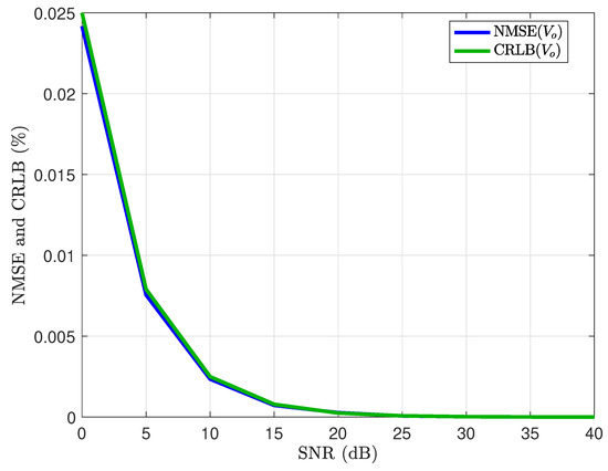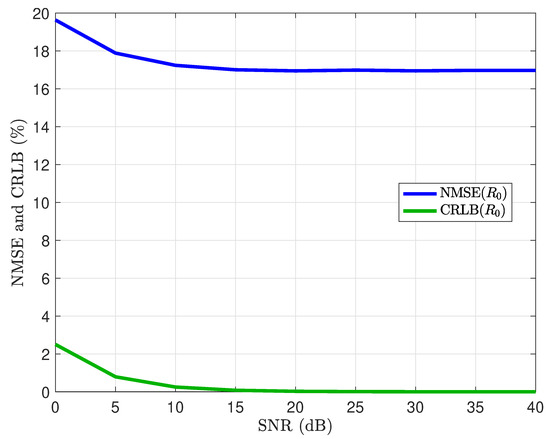 Similarly, in Figure 8, the NMSE of estimate is plotted with CRLB of for SNR values between 0 and 40 dB. The NMSE of estimate is calculated using (53) and the CRLB of estimate is calculated using (55). It can be observed again that the performance of the estimator is close to the theoretical bound CRLB and that the estimator is efficient.