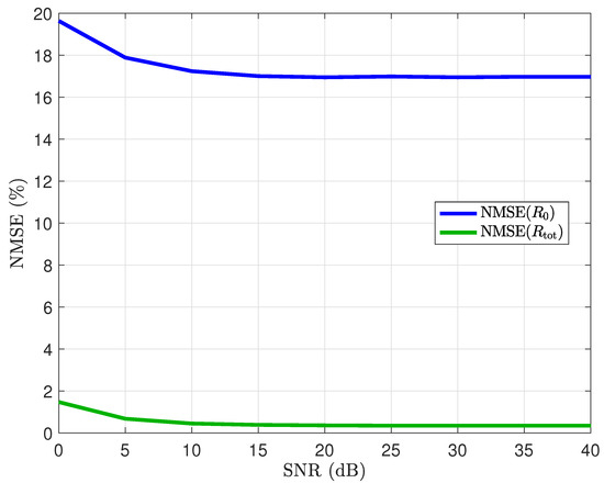 Here, the estimation error is computed with respect to the total resistance, defined as Figure 10 shows the computed NMSE based on the two different definitions given in (52) and (56). In this figure, it can be observed that is less than the NMSE for at all SNR levels. This means that the BMS under the Model 2 assumption estimates both resistances together, as a summation. Thus, it can be confirmed that the estimation of resistance of ECM Model 2 is approximately the sum of the two resistor components of Model 3.