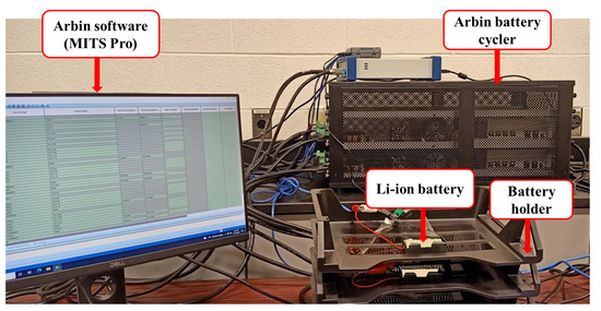In this subsection, the performance of the proposed approach for battery parameter estimation using data collected from a Samsung-30T INR21700 battery cell is presented. A current profile, shown in Figure 11 is applied to the battery and the voltage across the battery terminals is recorded. The data collection is performed using the Arbin BT-2000 battery cycler shown in Figure 12 and is made available in this link: https://data.mendeley.com/datasets/h3yfxtwkjz, accessed on 24 October 2022.