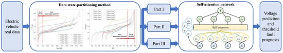 The early prognosis method for voltage fault presented in this paper is shown in Figure 1. First, depending on the SOC, the real voltage data are divided into three parts according to their trend. After that, a voltage prediction model based on the self-attention network is trained separately using the three parts of the data. Finally, voltage fault prognosis is realized based on the voltage predicted by the model and the threshold method.