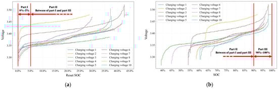 Charging voltage curves: (a) charging voltage curves after resetting the SOC; (b) original charging voltage curves.