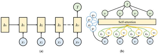Neural network structures: (a) recurrent neural network structure; (b) self-attention network structure.
