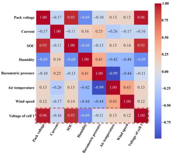 First, no data items that are constant when charging will be selected, because they do not provide valid information related to charging voltage. Then, among charging-related data items, for the temperature of probes 1 to 16, it is challenging to determine the correspondence with the cell, and applying all probe temperature data would increase the computation load. Therefore, the temperature of probes 1 to 16 was not selected. Finally, among the environment-related data items, the effect of precipitation on the battery system is less direct than that of humidity, and the effect of visibility is so low as to be negligible. Therefore, precipitation and humidity were not selected. The input data items were selected by calculating the correlation coefficients of the remaining data items. The correlation coefficients of the data items are shown in Figure 4.
