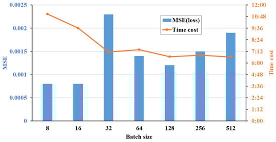 To efficiently train the neural network model, the samples are integrated into a batch to train the model, and back-propagation is performed to adjust the parameters. The batch size is the number of samples in one batch. If the batch size is too large, the number of times back-propagation is performed in one epoch will be low, which could lead to insufficient model training. If the batch size is too small, back-propagation will be performed too many times in an epoch, thus increasing the training time. This can easily lead to serious overfitting of the model in one epoch. That is, batch size affects model training in many respects. Therefore, optimizing the batch size is crucial. The effect on training when increasing the batch size exponentially from 8 to 512 was tested, and the MSEs and time costs were recorded, as shown in Figure 5.