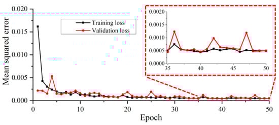 All data samples are divided into a training set, a validation set, and a test set, in proportions of 8:1:1, respectively. The model is trained according to the above settings and parameter optimization results, and the training set loss curve and validation set loss curve during the training process are shown in Figure 8.