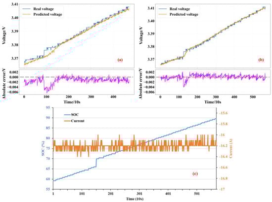 As can be seen from Figure 9, the optimized prediction results were much closer to the real voltage. The average error of the prediction results after optimization was less than 2 mV. The large voltage changes at around 100 points were also well predicted, avoiding the large absolute errors shown in Figure 9a. At the same time, the real voltage has a step-like curve due to the low accuracy of the data. The predicted voltage changes more gently, and the absolute error is around 0, which makes up for the low accuracy of the data, to some extent.