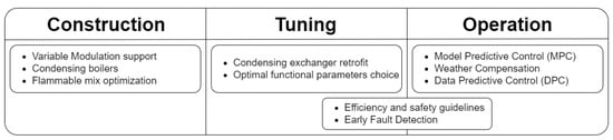 Since automatic optimization usually involves minimal or no user interference, one aspect of significant importance is monitoring, which helps ensure that the system operates in nominal conditions and detects any problems or errors related to safety and performance. A paper published by a team at DELFT University describes a set of fault detection and diagnostic tools for condensing boilers [48]. The system was designed to use real-time measurements in order to evaluate performance degradation, making it ideal for building energy management systems that can store limited amounts of data. Through extensive simulations, the effectiveness of those tools was verified both in terms of quick fault detection, but also in isolating the source of the problem. Such systems contribute to making sure that boilers remain at an optimal operational level, and they can be integrated in an optimization system in order to provide more complete and production-ready solutions.