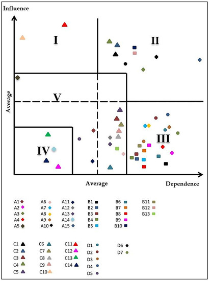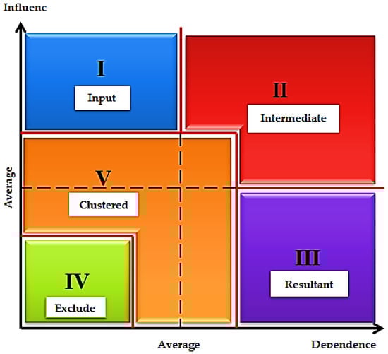Their placements illustrate the various roles performed by system factors (input factors, intermediate factors, resultant factors, excluded factors, and clustered factors). These maps illustrate the current and future participants’ perceptions of the system’s potentials (factors with high influence and dependency capacity), opportunities (factors with moderate influence and dependence capacity), and constraints (factors that cannot be affected) for change. By creating influence graphs, the networks or loops of connected components are formed [75] (a description is given in Appendix B).
