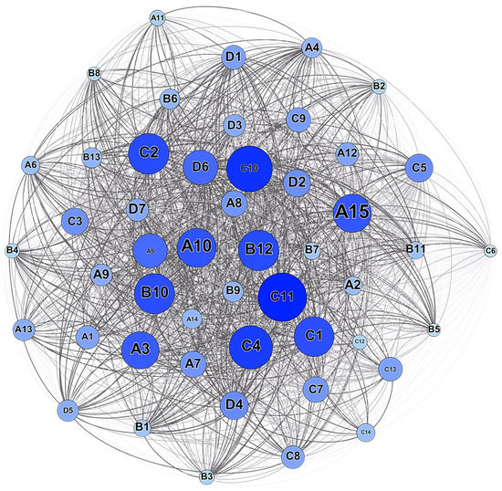Gephi software version 0.9.0 has been used to better display the relationships between factors. Figure 5, which is called the “weighted-out-degree” graph, shows the degree of influence of the factors on each other. Nodes that have a larger weighted out-degree value have more influence than other nodes. Weighted out-degree is a measure of the system-wide influence that a node has [77]. Based on Figure 5 and Table 4, the future orientation of government (stability and accountability of policies, the long-term vision of the government for developing AV industry) (C11), Managing the international sanctions for foreign investment (C10), Funding mega projects on AVs (C4) have the highest influence on other factors.