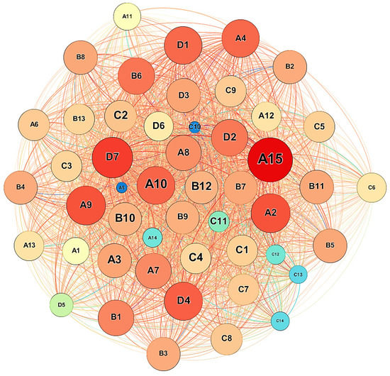 Figure 6, which is called a “weighted-in-degree” graph, shows the dependence of each factor on other factors. Nodes with high in-degree are in the center which can affect others easily. The weighted in-degree is a measure of the system-wide influence that a particular node has [77]. Based on Figure 6 and Table 4, the feasibility of using AVs in collective and shared modes (A15), and the number and quality of research publications/outputs and training/education activities (D7) receive the highest influence from other factors.