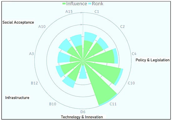 Based on Table 5 and the explanations provided in the appendix, the influence and rank of the key AV adoption factors are as shown in Figure 7.