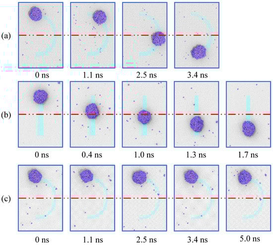The self-actuation of the droplet along the curve under three track widths was simulated. The instantaneous pictures for the motion are displayed in Figure 7; the curved tracks in group a, group b, and group c are narrowed in succession and the droplet separately takes 2.1, 1.82, and 2.22 ns to move from the start to the endpoint. The average motion velocities of the droplet in the three groups are 10.19, 11.14, and 8.83 m/s, respectively, see Figure 8a. After changing the track width, it can be found that, for a given initial width, the wider the track, the larger the rate of change of the track width in the direction of motion, which is more beneficial for the rapid motion of the droplet. Comparison of droplet motion in group a and group b shows that the droplet motion follows the trend; however, the droplet motion takes the longest time in group c with the widest track, corresponding to the lowest average motion velocity. Combined with analysis of Figure 8b, the motion of the droplet decelerates in the second half of the curved track. This is because the area of the most contact between the droplet and the surface is within the track as the track width increases, so that the contact area between the droplet and the more hydrophilic track enlarges, which affects the motion of the droplet. Meanwhile, the contact area between the droplet and the boundary shrinks; therefore, the driving force on the droplet is weakened, thus decelerating the motion of the droplet. The conclusion is, therefore, that an increase in the track width is conducive to the self-actuation of the droplet, while the self-actuation of the droplet is affected if the track is further widened, thus decreasing its velocity. Once the track width is larger than the spread-width of the droplet, that is, the droplet is completely within the track, the driving force on the droplet disappears, so the droplet stagnates on the track.