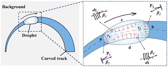 The droplet on the curved track is divided into four parts, in which a and b are the menisci of the droplet in the front and rear ends along the direction of motion; c and d are the droplet parts in contact with the two sides of the track, as shown in Figure 4.